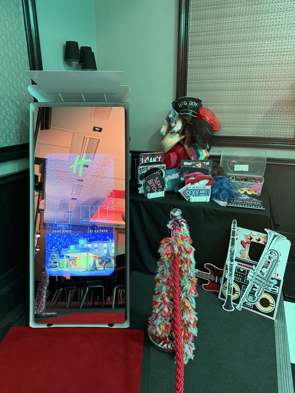 Longer hire times can be agreed for corporate events or trade shows. Prop Box which includes Glasses, Hats, Wigs and Word boards